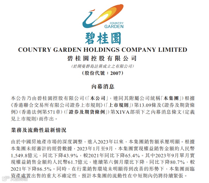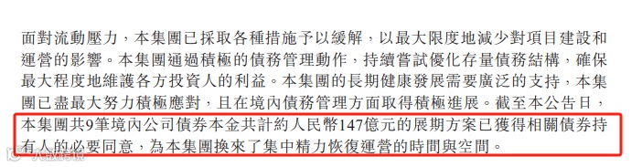 碧桂园称,希望通过寻求整体方案来全面解决本公司当前境外债务风险,以时间换空间,使得本公司能有机会用实际行动努力经营,化危机为生机,重回良性发展轨道,最大程度保障包括客户、员工、债权人在内的所有利益相关方的权益。
