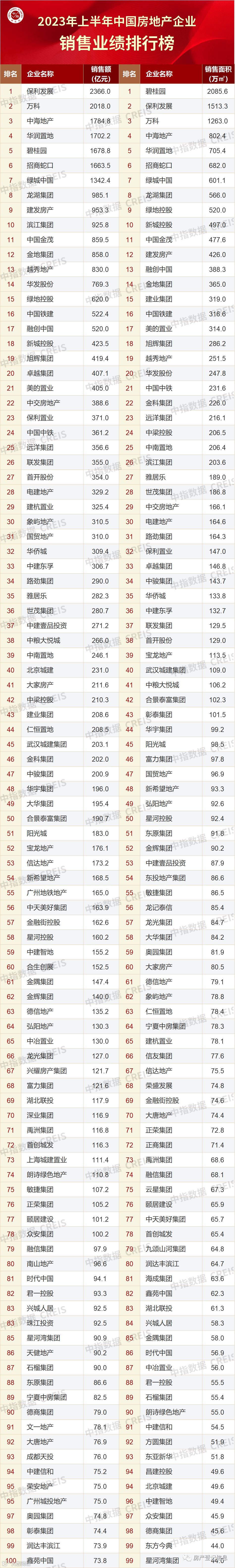 6月30日,中指研究院发布2023上半年中国房地产企业销售业绩排行榜。榜单显示,保利发展、万科、中海地产位列前三甲。此外,今年上半年,千亿以上房企7家,较去年同期减少2家。