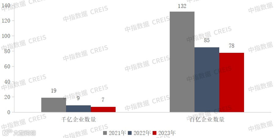 2023年上半年,千亿以上阵营企业数量有所减少。具体来看,千亿以上阵营7家,较去年同期减少2家,销售额均值1793.7亿元。第二阵营(500-1000亿)企业10家,较去年同期增加3家,销售额均值784.3亿元。第三阵营(300-500亿)企业16家,较去年同期减少1家,销售额均值358.3亿元。第四阵营(100-300亿)企业为45家,较去年同期减少7家,销售额均值171.4亿元。