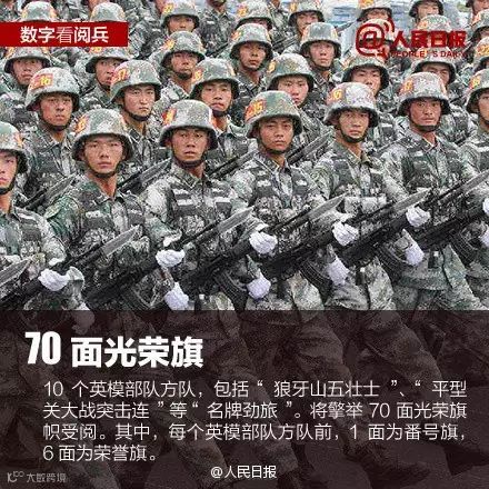 阅兵当天共有56门礼炮,寓意56个民族心手相连;呈八字形等距排列,意指中国人民经历八年抗日战争。