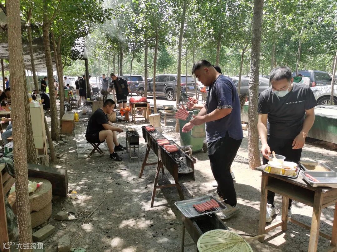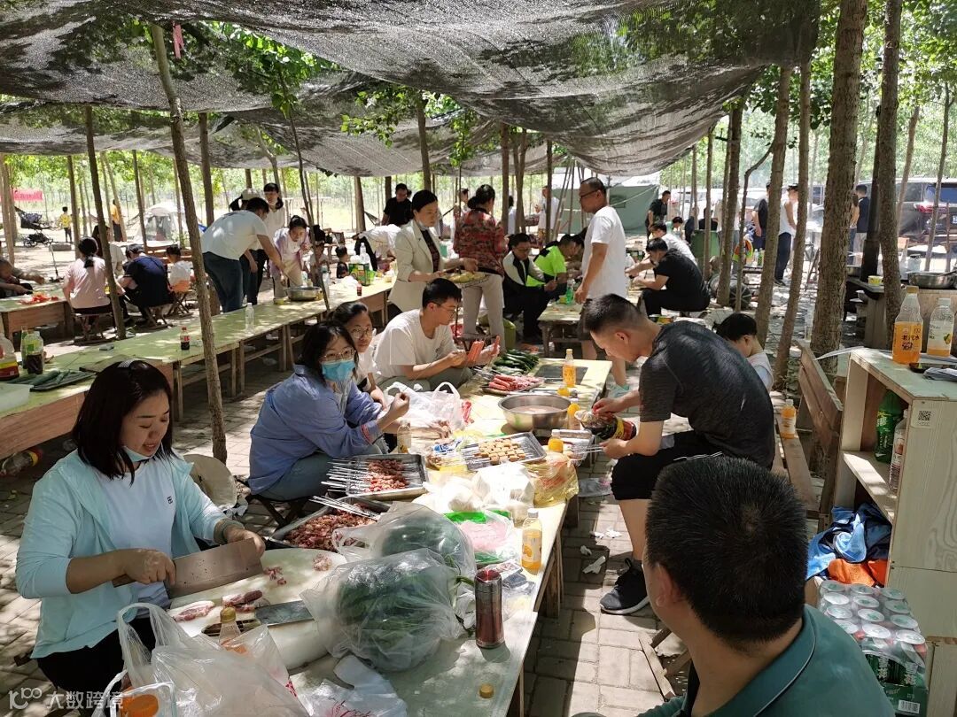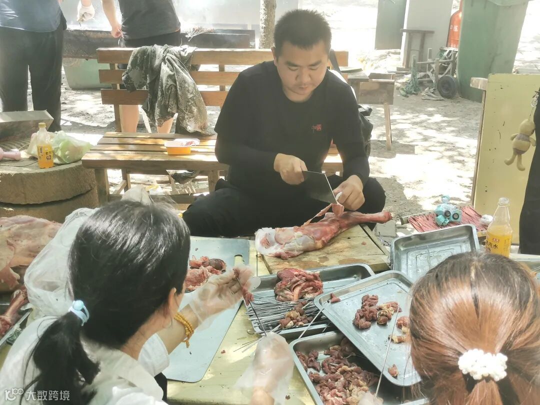 上午11点,大家陆续来到团建场地,搭烧烤架、洗刷托盘烤签。准备好烧烤工具后,大家分成三组,一组负责将猪肉、羊肉、土豆等食材切好备用;一组负责把切好的肉块、鱼豆腐、烤肠等穿串;另外一组负责生火烧烤。大家分工有序,烧烤团建活动顺利进行。