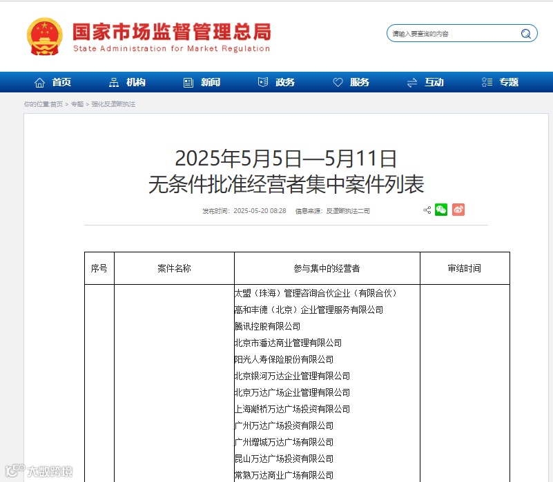 中国国家市场监督管理总局星期二(5月20日)在一则公告中列出了参与上述交易投资方,包括腾讯控股有限公司、阳光人寿保险股份有限公司,以及一家由京东支持的投资载体。但公告未披露更多细节。