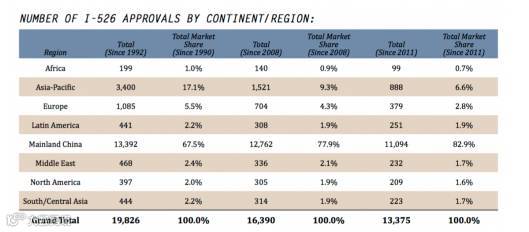 中国大陆累计有13,392个家庭获发投资移民签证I-526(有条件绿卡,两年后转为永久绿卡—),占所有获批人数的67.5%,投资金额累计达66.96亿元。