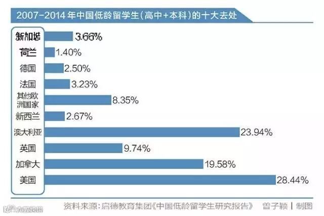 2007至2014年中国低龄留学生(高中+本科)的十大去处