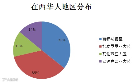 根据2015年西班牙国家统计局截止到2015年年底的数据,在西班牙共生活了186,031名拥有合法居留身份的华人,其他大部分分布在首都马德里以及以巴塞罗那为首府的加泰罗尼亚大区。其中在马德里生活了49,831名华人,加泰罗尼亚大区49,773名,瓦伦西亚大区20,475名,排名第四的是安达卢西亚大区,共有19,496名华人居住。
