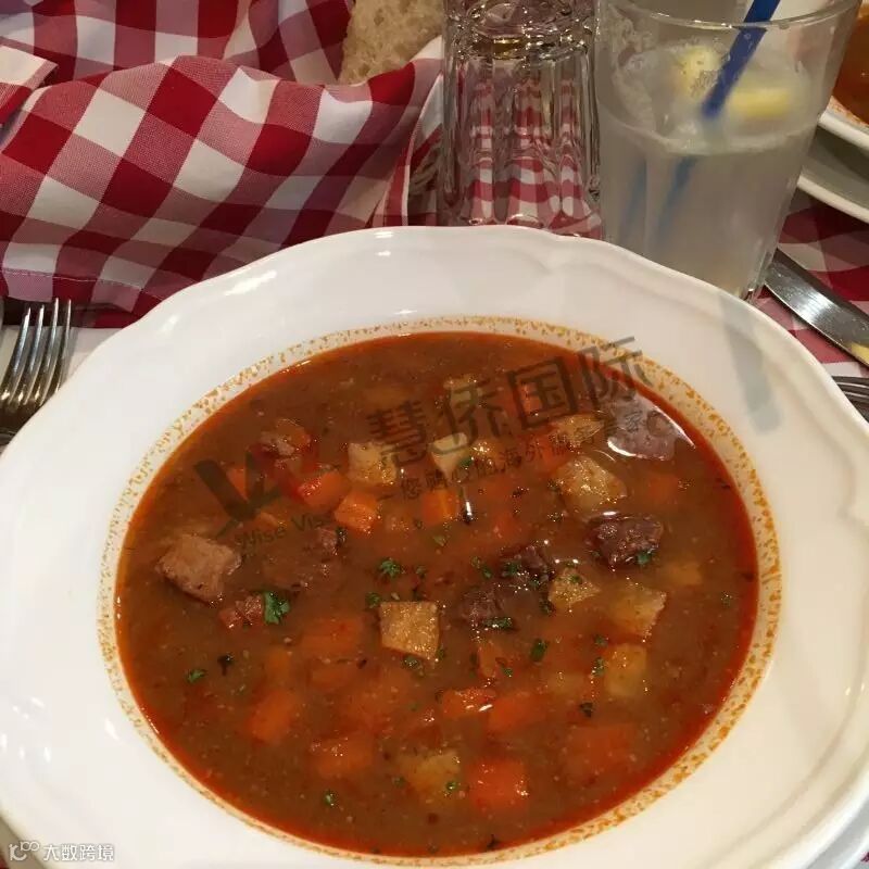 说到匈牙利美食,那么最著名的莫过于匈牙利牛肉汤 Gulyás (英语 Goulash),在匈牙利是每个主妇都会烹饪的家常菜,主要食材是牛肉,配以甜椒、洋葱、番茄,加上盐、胡椒和红辣椒粉调味,有些地区还会在汤中加入鸡蛋与面混合制成的面疙瘩。