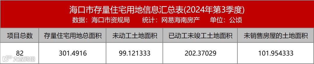 近日,海口市自然资源和规划局公布《2024年海口市第3季度存量住宅用地信息》。