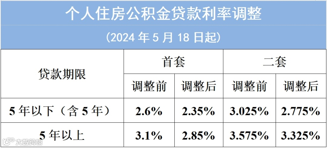 5月17日,中国人民银行决定,自2024年5月18日起,下调个人住房公积金贷款利率0.25个百分点,5年以下(含5年)和5年以上首套个人住房公积金贷款利率分别调整为2.35%和2.85%,5年以下(含5年)和5年以上第二套个人住房公积金贷款利率分别调整为不低于2.775%和3.325%。