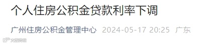 17日,“广州住房公积金管理中心”微信公众号发布通知称,根据中国人民银行《关于下调个人住房公积金贷款利率的通知》,自2024年5月18日起,下调个人住房公积金贷款利率0.25个百分点,5年以下(含5年)和5年以上首套个人住房公积金贷款利率分别调整为2.35%和2.85%,5年以下(含5年)和5年以上第二套个人住房公积金贷款利率分别调整为不低于2.775%和3.325%。