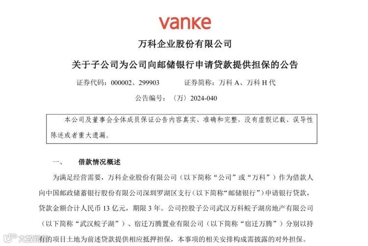 5月10日晚间,万科企业股份有限公司公告,公司向邮储银行申请13亿元贷款,由子公司提供担保。