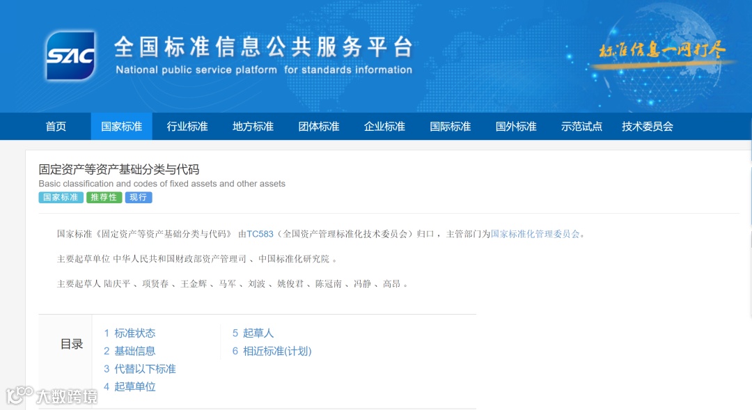 为推进预算管理一体化系统建设,构建预算管理、资产管理、政府采购环环相扣的全链条闭环管理体系,由中华人民共和国财政部提出,由全国资产管理标准化技术委员会归口,中华人民共和国财政部组织开展GB/T 14885—2010《固定资产分类与代码》国家标准修订工作。北京久其软件股份有限公司作为全国资产管理标准化技术委员会受邀单位,协同开展《固定资产等资产基础分类与代码》的修订工作,并在主管部门的指导下依托国家标准开展实施应用和推广采标等事项。