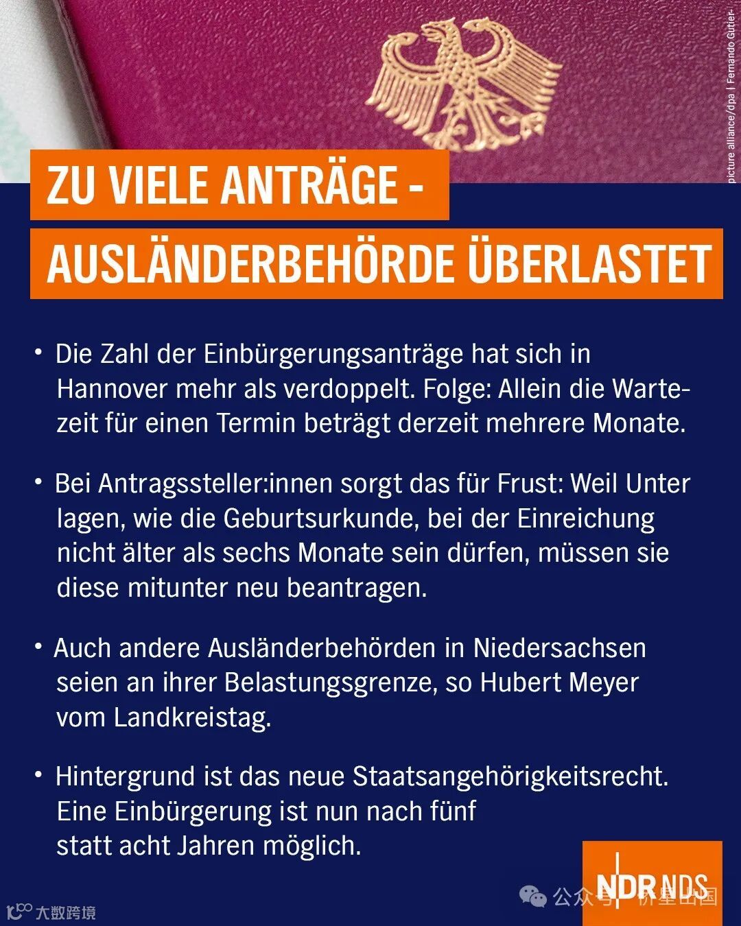 据悉,德国下萨克森州汉诺威市的入籍申请数量增加了一倍多,当地外管局不堪重负,仅预约的等待时间目前需要几个月时间!☹️另外让申请人感到沮丧的是,由于出生证明等文件的有效期不得超过六个月,这让他们有时不得不再次申请😤。