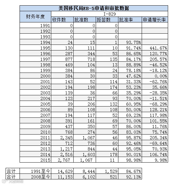 累累表格数据,显示出二十几年来美国EB5投资移民的通过率和审批率整体处于一个上升趋势。正如我们所知,EB5投资移民法案延期至2016年9月,仅仅50万美元的投资额还剩9个月的时间,抢占先机刻不容缓!如果你觉得50万美元的EB5投资移民还是太贵了,不妨试试仅有70万RMB的EB3技术移民项目。1月9日慧侨将会举办美国EB3技术移民官方发布会,期待你的参与!免费预约热线:400-6066-010