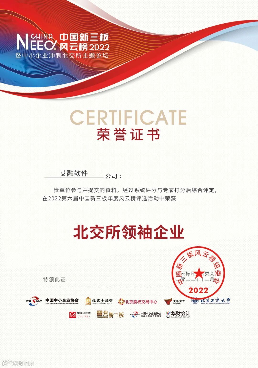 艾融软件荣获2022中国新三板年度风云榜北交所领袖企业奖项