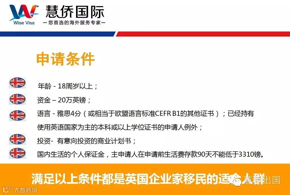 慧侨国际专家分析:英国企业家移民、投资移民凭较低门槛、高福利仍持续受宠,且有望在将来成为主流趋势,随着9月美国移民即将涨价,相信今年10月将会出现英国企业家移民以及投资移民的特大井喷!特别是英国企业家移民仅需20万英镑