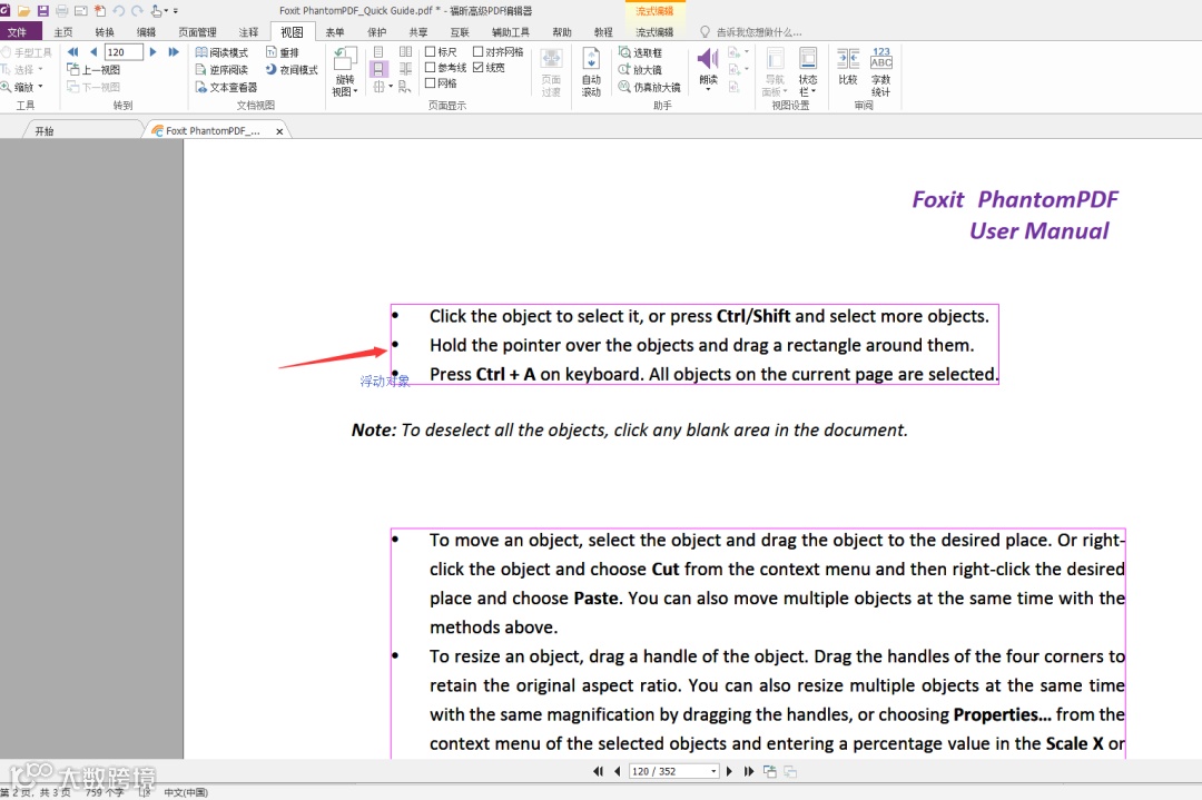 3. 在进入到流式编辑模式下,会看到有部分文本是被粉色框包围着,这些叫做浮动对象。编辑浮动对象,请双击粉色框进入到具体的某个粉色框中去编辑文本。这个粉色框会随着添加或删除文本而移动。若需要移动浮动对象的位置,请直接用鼠标单击选中浮动的对象然后拖动选中的对象到您想要的位置。没有被粉色框包围的文本,您可以直接像在Word中一样进行编辑那些文本。