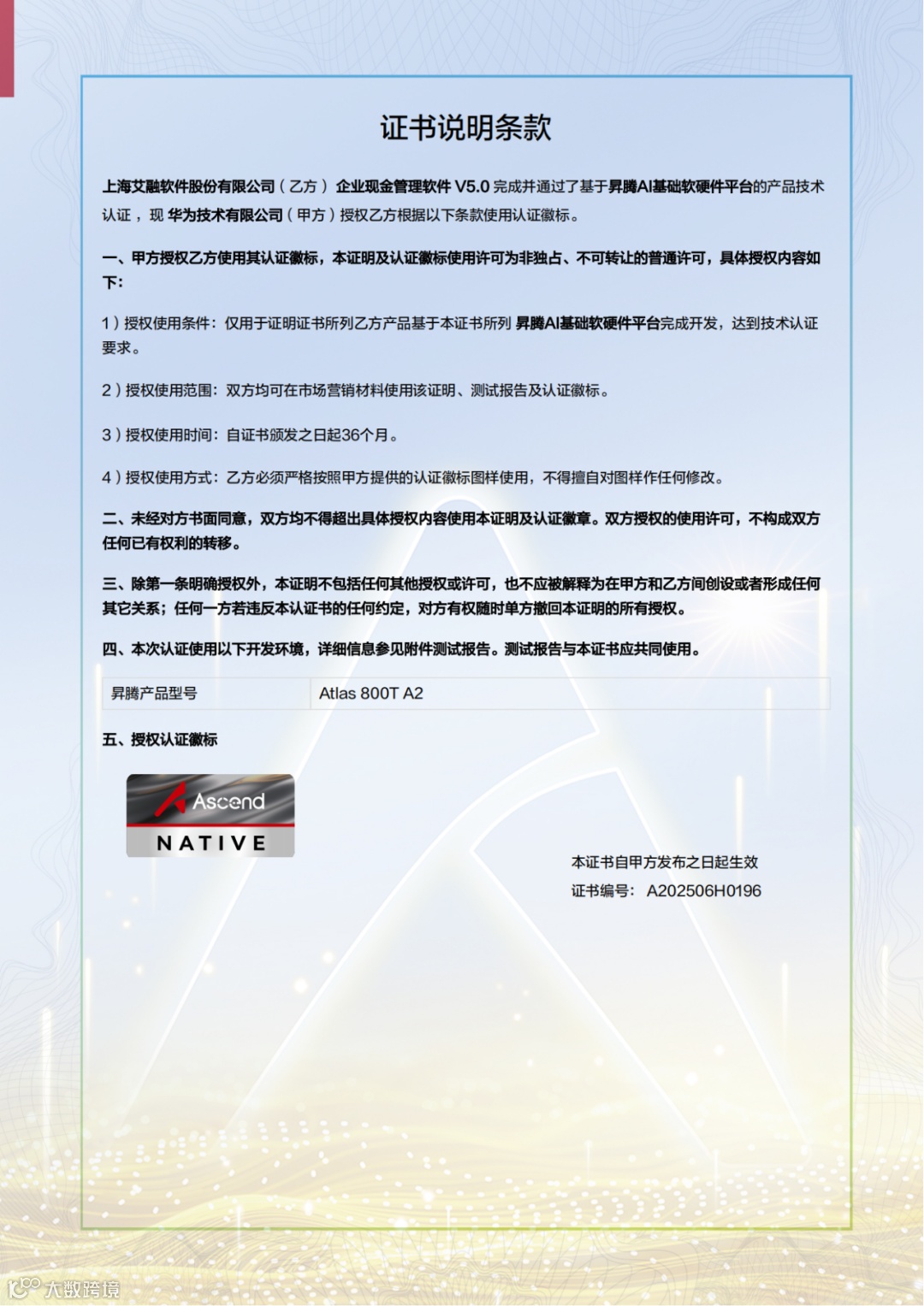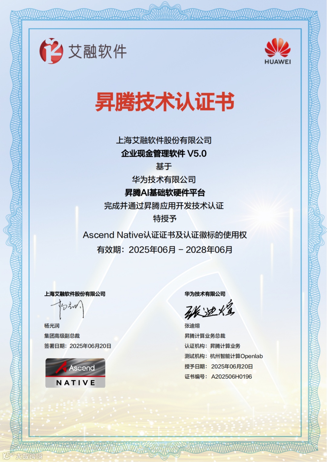 在金融科技飞速发展的今天,智能化转型已成为企业提升竞争力的关键。2025年6月20日,上海艾融软件股份有限公司迎来了一个重要的里程碑,其企业现金管理软件V5.0成功通过华为昇腾AI基础软硬件平台的开发认证,获得了AscendNative认证证书及认证徽标使用权,有效期至2028年6月。这不仅是艾融软件与华为深度合作的成果,更是企业财资管理智能化征程的关键一步。