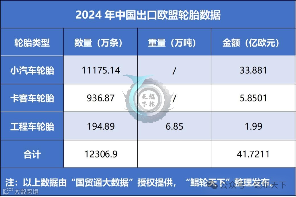 2024年,我國出口欧盟轮胎总计:12306.9万条,金额41.7211欧元。