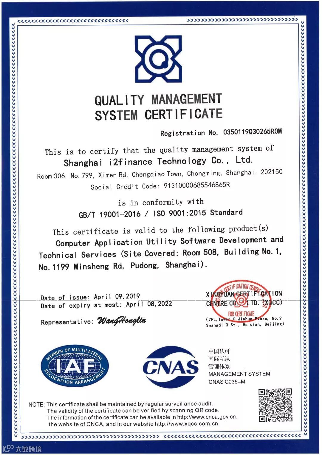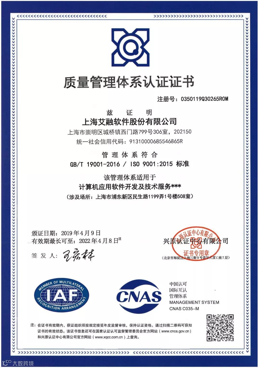 近日,上海艾融软件股份有限公司(以下简称艾融软件)顺利通过了ISO9001质量管理体系认证,这是自2013年首次通过ISO9001 质量管理体系认证后,通过的第三轮复评认证,至今已是第六个年头。ISO9001是质量管理体系核心标准之一,通过对影响产品质量的各种因素进行系统化、规范化的有效控制,证实公司具备持续稳定地提供满足顾客要求和法规要求的产品的能力,目的在于增进顾客满意度。此次认证通过意味着艾融软件在各项管理系统整合上已达到了国际标准。