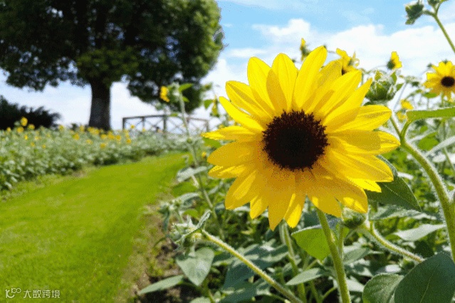 深秋,是活力黄。沿着花间小径一路登顶,道路两旁全是盛开的向日葵,每一朵都是喜悦的姿态,壮观又热烈,在蓝天白云的映衬之下显得格外好看,随手一拍就是手机壁纸。