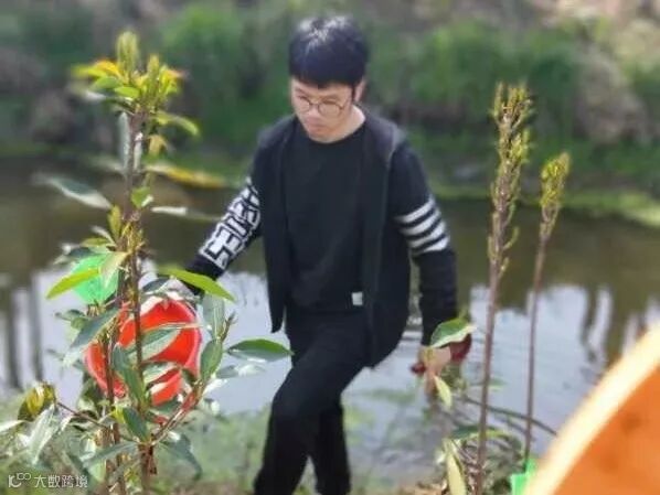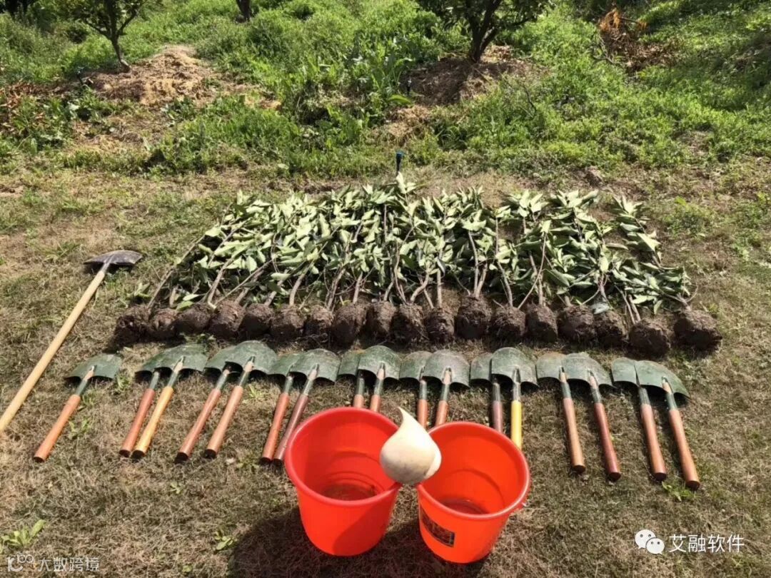 到达目的地后,员工们组队开始选树苗、拿铁锹、刨坑、挖土、打水...
