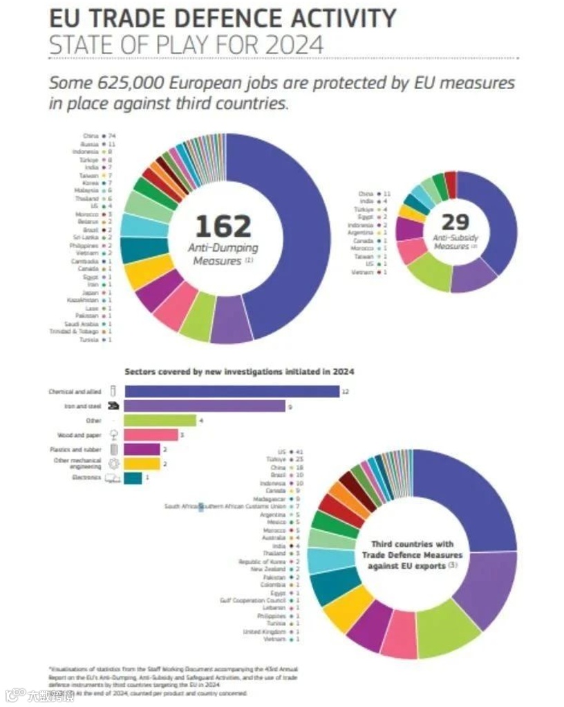 近日,欧盟最新发布的2024年贸易防御工具报告,显示其贸易救济措施运用达到“历史高位”,共维持199项反倾销、反补贴及反规避措施。然而,这些措施的应用存在显著不平衡:在162项反倾销措施中,中國独占74项,远高于俄罗斯的11项;29项反补贴措施中,涉华也多达11项。报告特别以电动汽车反补贴案为例,突显了欧盟在“不公平贸易”和“经济安全”叙事下,针对中國产品(尤其是钢铁和化工产业链)过度使用贸易救济工具的趋势,这与中欧实际贸易比例明显不相称。
