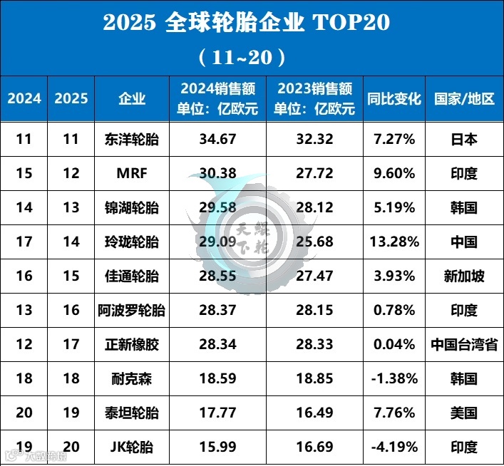而印度JK轮胎(15.99亿欧元,-4.19%)排名下降1位;№.16位的阿波罗轮胎(28.37亿欧元,+0.78%)下降3位;№.17位的正新橡胶(28.34亿欧元,+0.04%)下降5位。