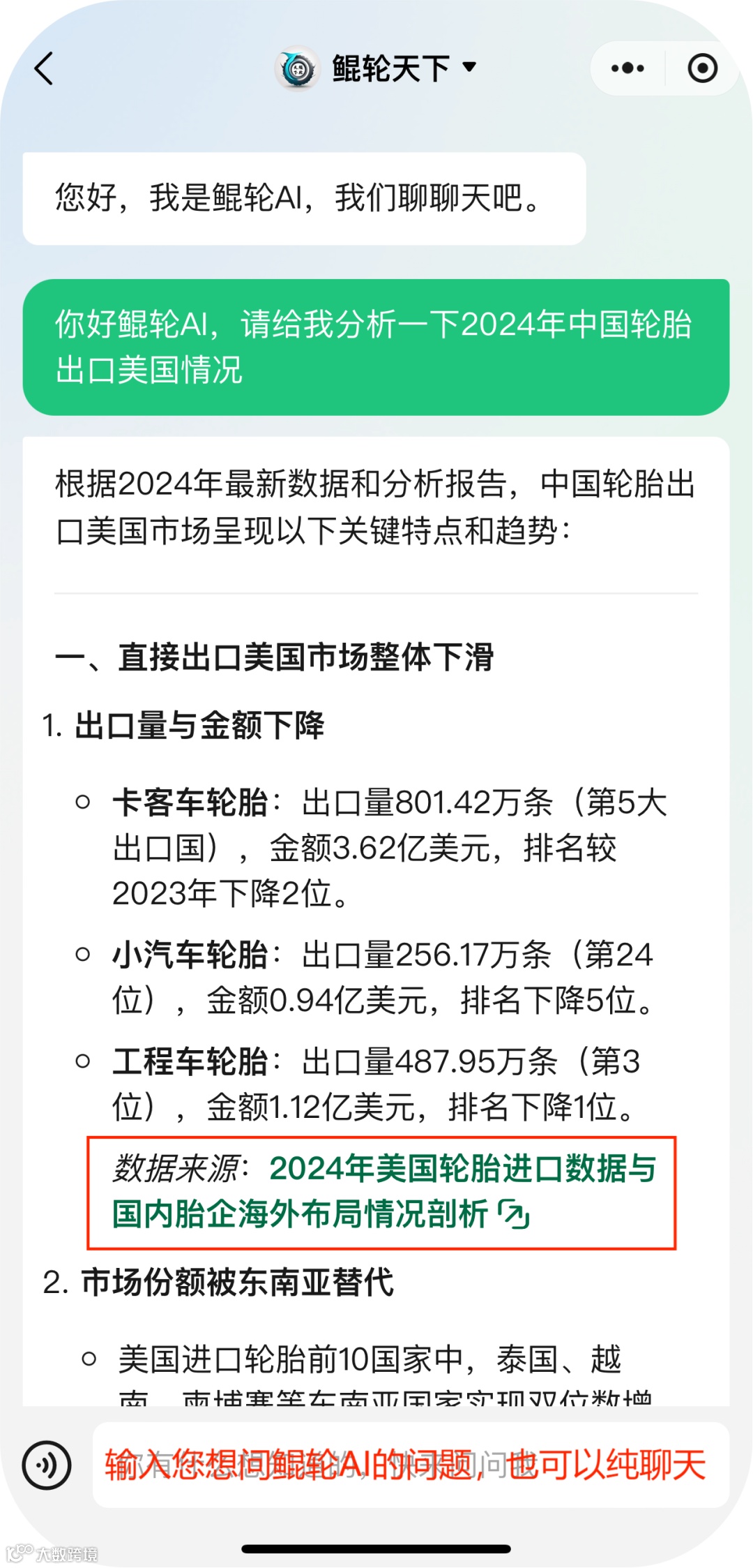 “鲲轮AI”的上线,只是0~1的一个开始,是“鲲轮天下”作为专业的轮胎产业链信息共享平台、为轮胎上下游更好服务的构建的一个“智能体”工具。随着科技进步,我们对行业的观察、思考和积累越多、越细、越深,就越能实现1~∞的无限可能。