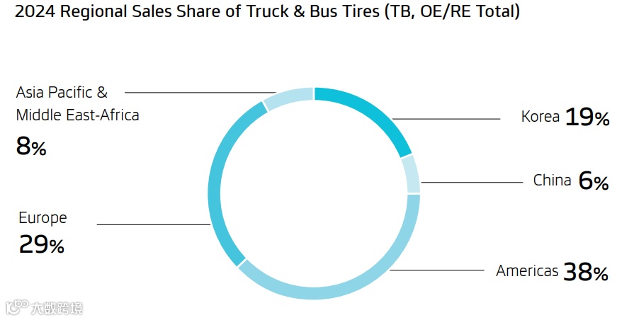 按区域划分,卡车及客车轮胎的销售份额:韩国19%、中国6%、美洲38%、欧洲29%、亚太及中东非洲8%。值得注意的是,北美市场在该细分领域内实现了最显著的销售增长[1]。
