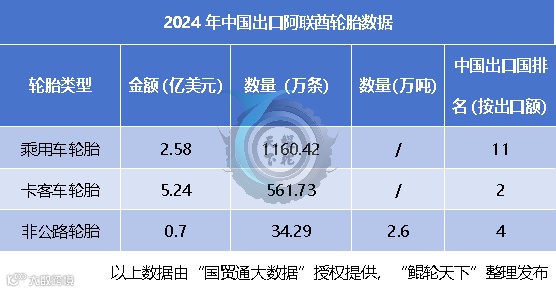 从上述2024年我国出口阿联酋的轮胎数据来看,以卡客车及非公路轮胎出口为主,其中卡客车轮胎出口额为5.24亿美元,出口数量561.73亿美元,为我国第二大出口卡客车轮胎的市场,占我国卡车车出口总额的5.31%,非公路轮胎出口金额为0.7亿美元,出口数量为2.6万吨,出口额占我国非公路轮胎出口额的3.28%。体现了我国卡客车轮胎及非公路轮胎在阿联酋的较强的市场竞争力,也体现了阿联酋市场对物流、运输和能源行业的特定需求。