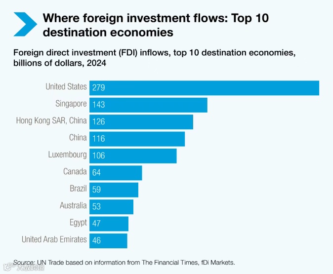联合国贸发会议最新《2025年世界投资报告》显示,阿联酋已成为全球投资焦点,2024年以创纪录的456亿美元外国直接投资(FDI)跃居全球十大FDI目的地,同比飙升48%。其吸引力尤为突出,占据了整个中东地区FDI流入量的37%,相当于该地区每100美元外资中就有37美元流向阿联酋。迪拜酋长将这一成就归功于阿联酋作为“无限机遇之地”和创新企业首选目的地的地位。