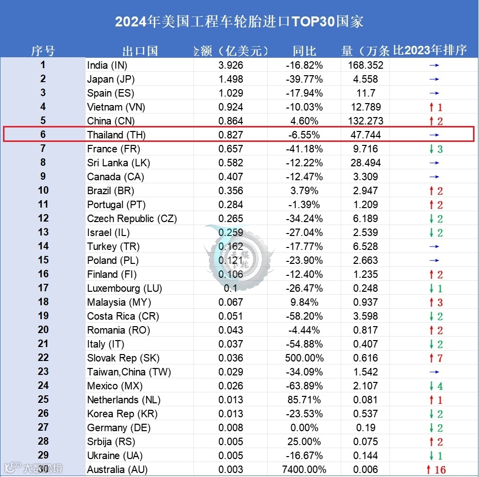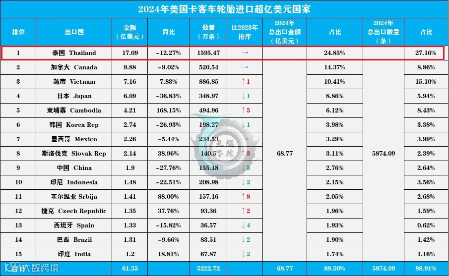 泰国是全球第二大轮胎出口国,出口量占全球的7.1%,而美国是全球最大的轮胎消费国之一,我们来看一下2024年泰国出口至美国的轮胎一些基础数据: