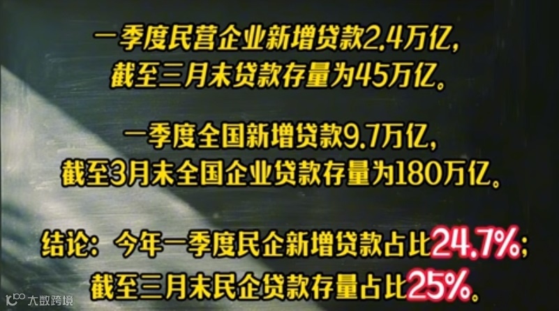 三月末,全国的所有企业贷款余额为180万亿,其中民营企业贷款余额为45万亿,占比25%。这两个数据是对应的起来的。
