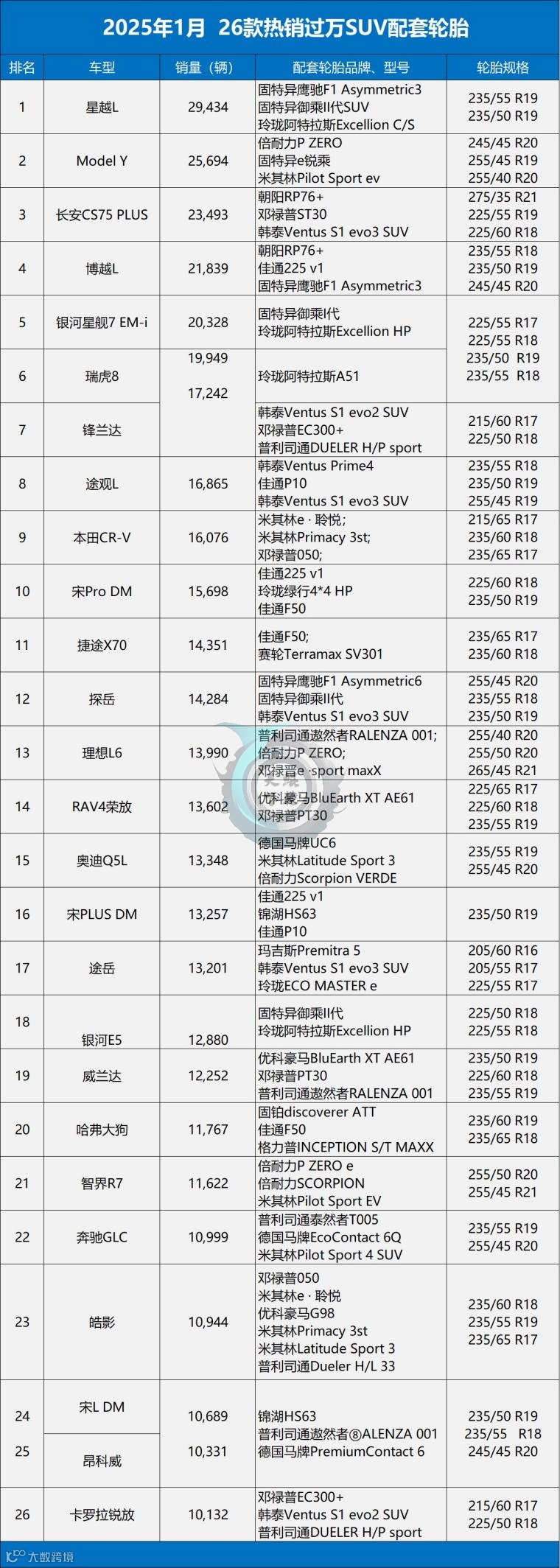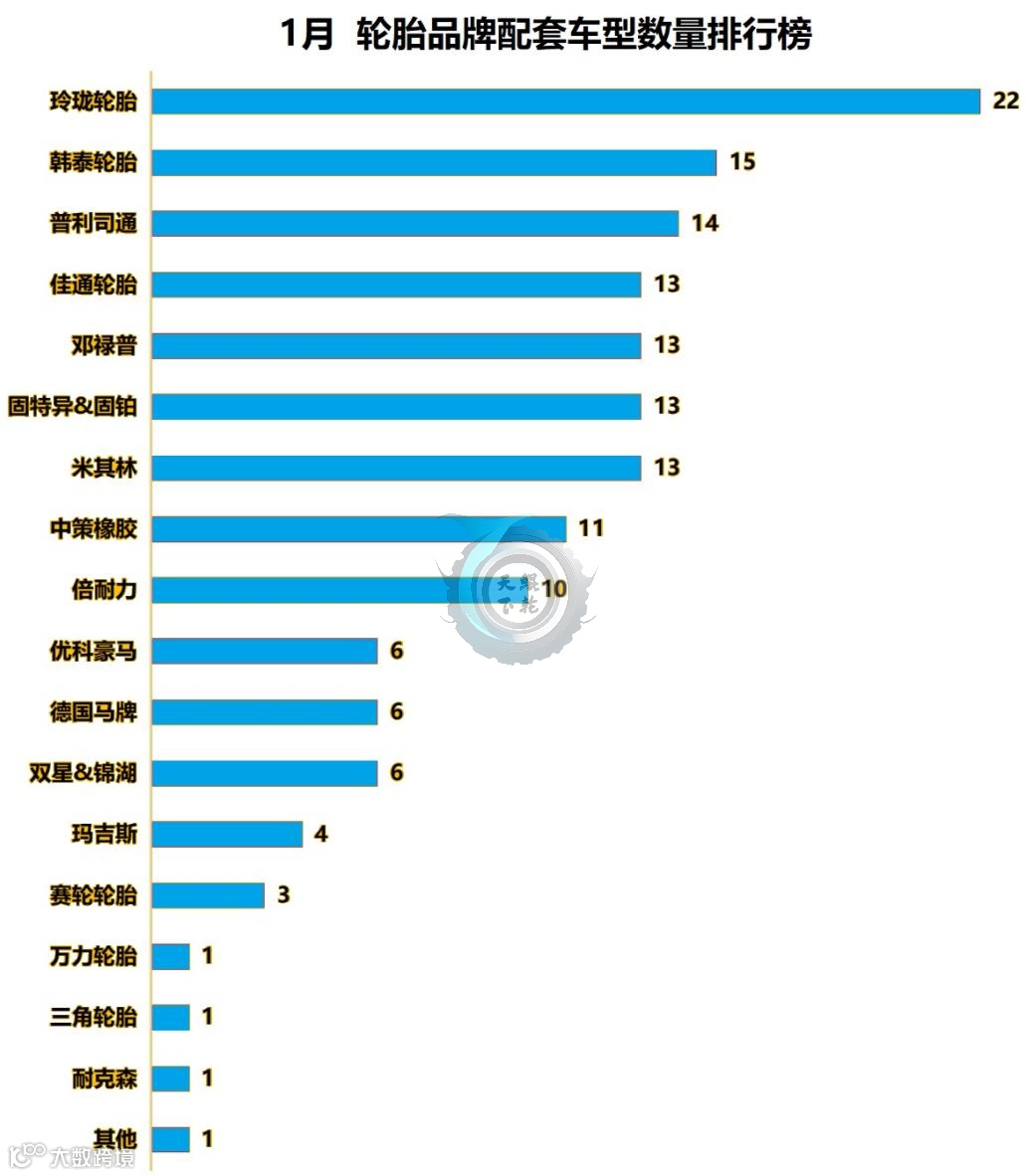 轮胎作为汽车产业链的重要一环,其配套数据不仅反映了行业的竞争态势,也揭示了技术演进的方向。“鲲轮天下”基于1月乘用车(含轿车、SUV)的畅销车型的配套轮胎数据,进行分类统计浅析。