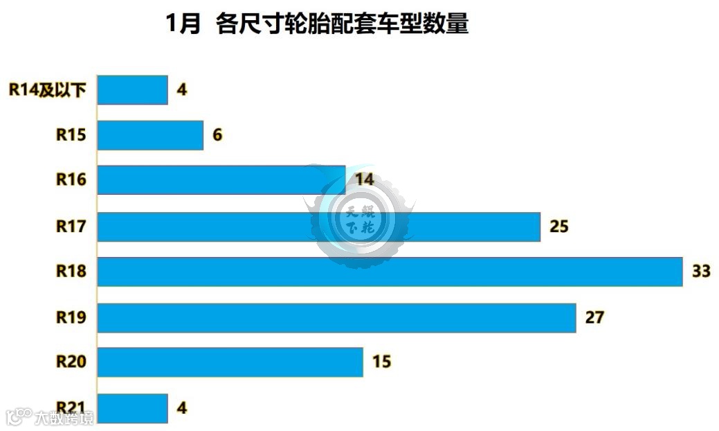 除了品牌格局的变化,1月畅销车轮胎尺寸数据也揭示了明显的“大尺寸化”趋势。R17及以上占比超80%,部分车型甚至提供R21选项。