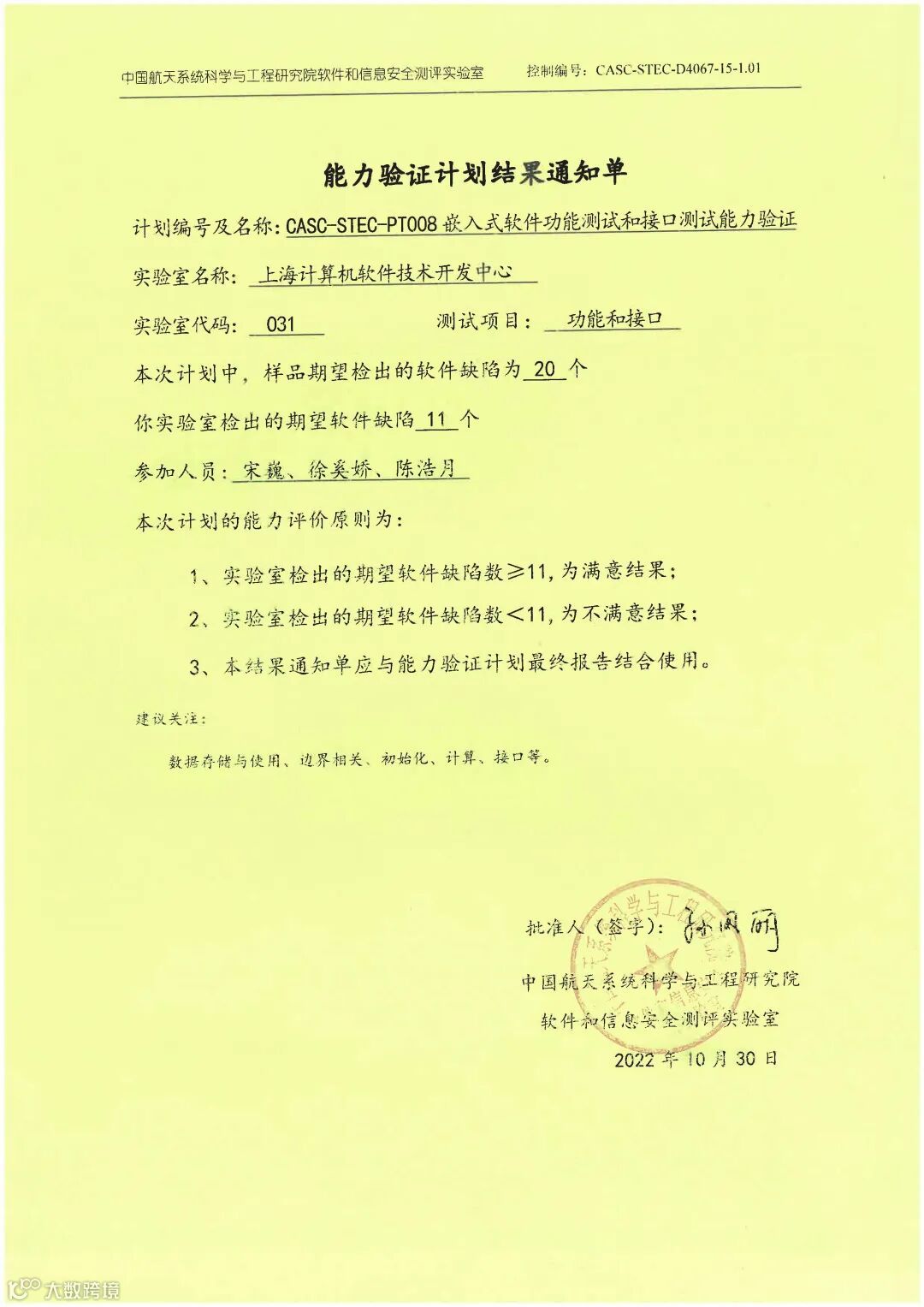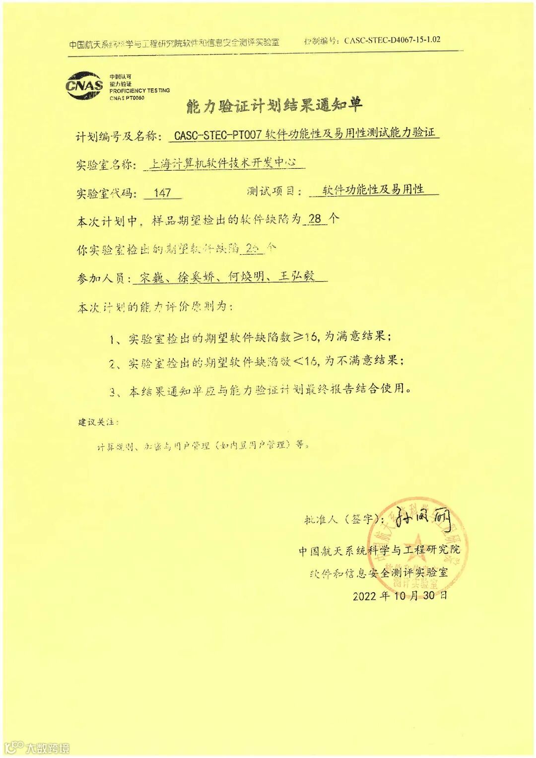 上海计算机软件技术开发中心在2022年分别参加了“CASC-STEC-PT007软件功能性及易用性测试”、“CASC-STEC-PT008嵌入式软件功能测试与接口测试”两项能力验证,均取得了优异的成绩。在“CASC-STEC-PT007软件功能性及易用性测试”中,获得“满意”评价,缺陷检出数量在全国322家参评实验室中名列第一名;在“CASC-STEC-PT008嵌入式软件功能测试与接口测试”中,获得“满意”评价。