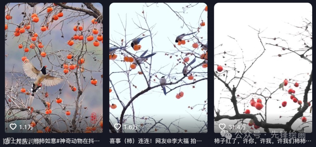 《小鸟吃柿子》这类作品本月很多作者都做爆了。最高做到了31.4万点赞,同学们到抖音搜索:“柿子红了,许你,许我,许我们柿柿如意。” 标题就可以看到大量这样的作品。