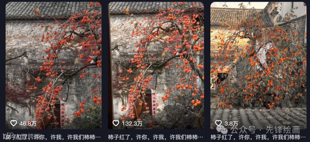 《推窗柿子树》这类作品本月很多作者都做爆了。最高做到了132.34万点赞,同学们到抖音搜索:“柿子红了,许你,许我,许我们柿柿如意。” 标题就可以看到大量这样的作品。