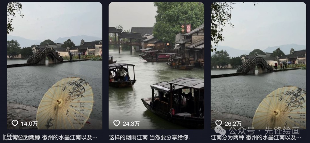 《宏村下雨》这类作品本月很多作者都做爆了。最高做到了398.7万点赞,同学们到抖音搜索:“江南分为两种 徽州的水墨江南以及苏杭的烟火人间.” 标题就可以看到大量这样的作品。