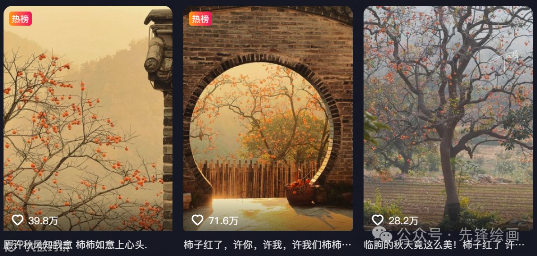 《爆款柿子树》这类作品本月很多作者都做爆了。最高做到了71.6万点赞,同学们到抖音搜索:“柿子红了,许你,许我,许我们柿柿如意。” 标题就可以看到大量这样的作品。