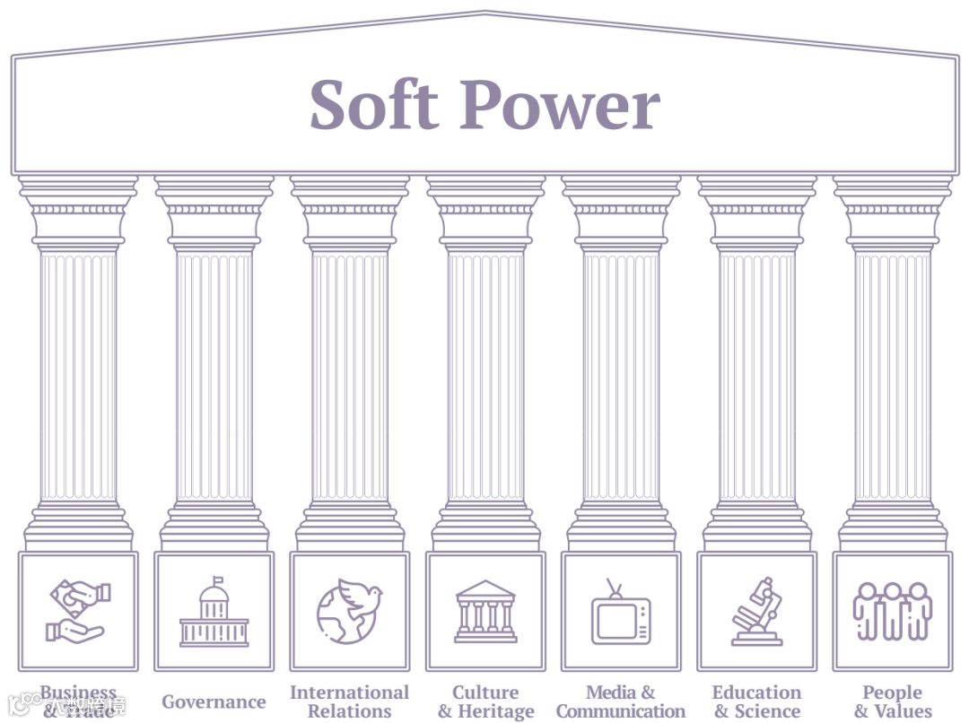 软实力可以看作是一个国家在文化、价值观、意识形态及民意等方面的影响力,是通过吸引或说服的方式来影响在国际上接受与认同程度。可参考上图软实力的各项来理解。