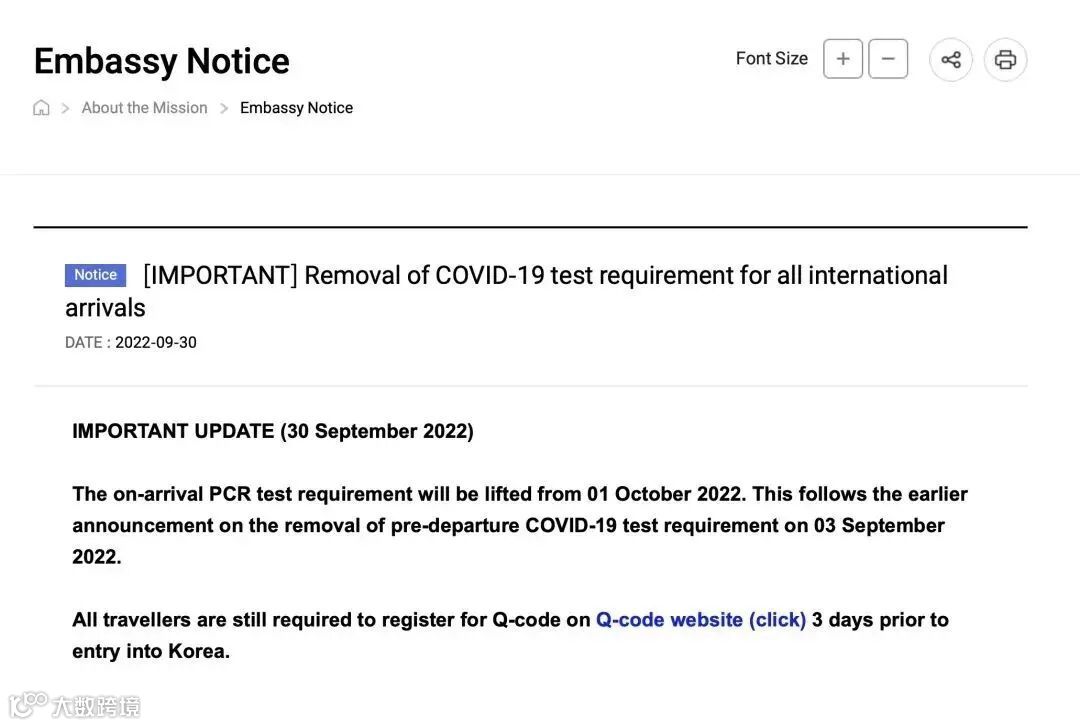 从2022年10月1日起,取消入境时的新冠核酸检测,不需要进行隔离。不过所有旅客仍需在入境韩国前3天在 Q-code 网站上注册信息,网址如下: