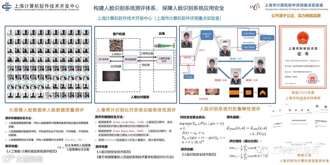 “创新人脸识别系统测评技术,提升人工智能应用安全可靠”案例从提升人脸识别安全性出发,构建包含人脸数据质量、人脸识别系统功能有效性、安全鲁棒性等测评能力体系,通过自主研发人脸识别对抗算法与系统,创新性地解决人脸识别系统对抗鲁棒性评估的难题,完成了若干项典型的人脸识别系统测评项目;本案例形成了三项原创性的团体标准,首次在国内提出“人脸识别安全技术规范”,保障了人脸识别应用的安全性,引导人脸识别产业健康发展。本案例相关技术成果和质量保障工作荣获上海市科技进步特等奖。