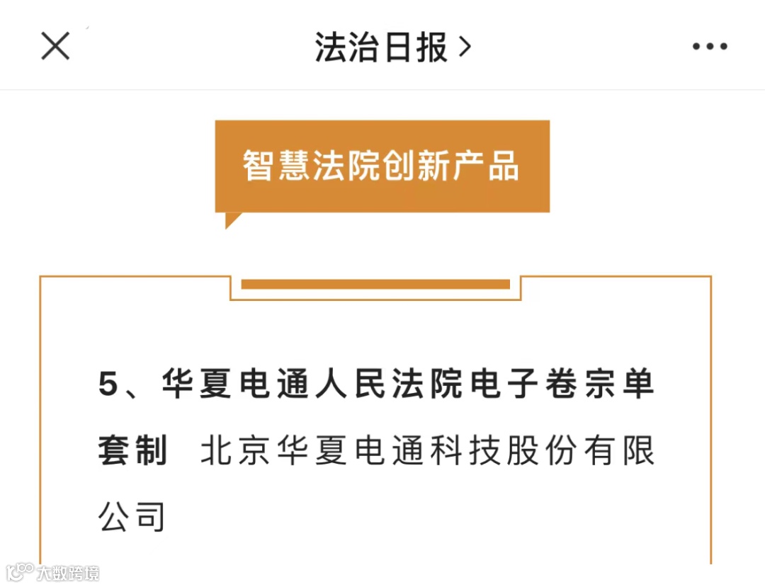 近日,由中央政法委机关报《法治日报》主办的“2022政法智能化建设创新案例和论文征集宣传活动”评选结果公布,“华夏电通电子卷宗单套制产品”凭借技术的创新性、良好的运用成效和可复制推广价值顺利入选“智慧法院创新产品”榜单。