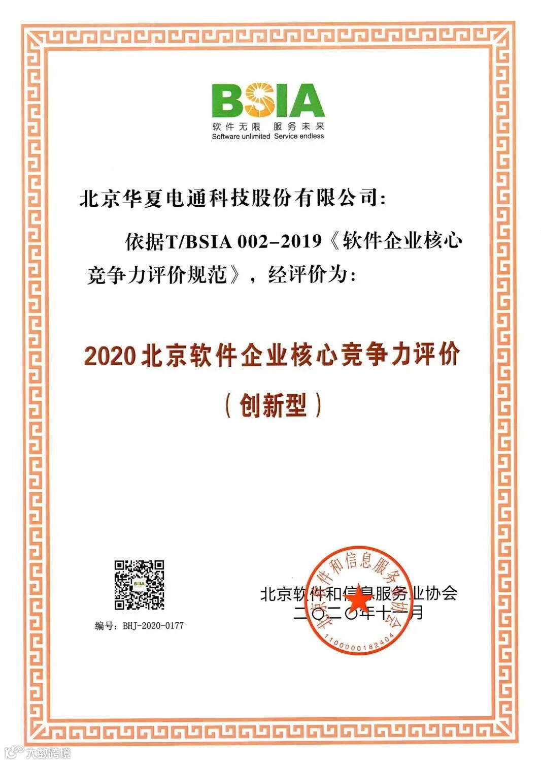 近日,北京软件和信息服务业协会(简称“北京软协”)第十届会员代表大会第一次会议暨第十届理事会第一次会议在北京召开。会上发布了《2020北京软件企业核心竞争力评价报告》等,华夏电通荣获2020北京软件企业核心竞争力评价(创新型)。