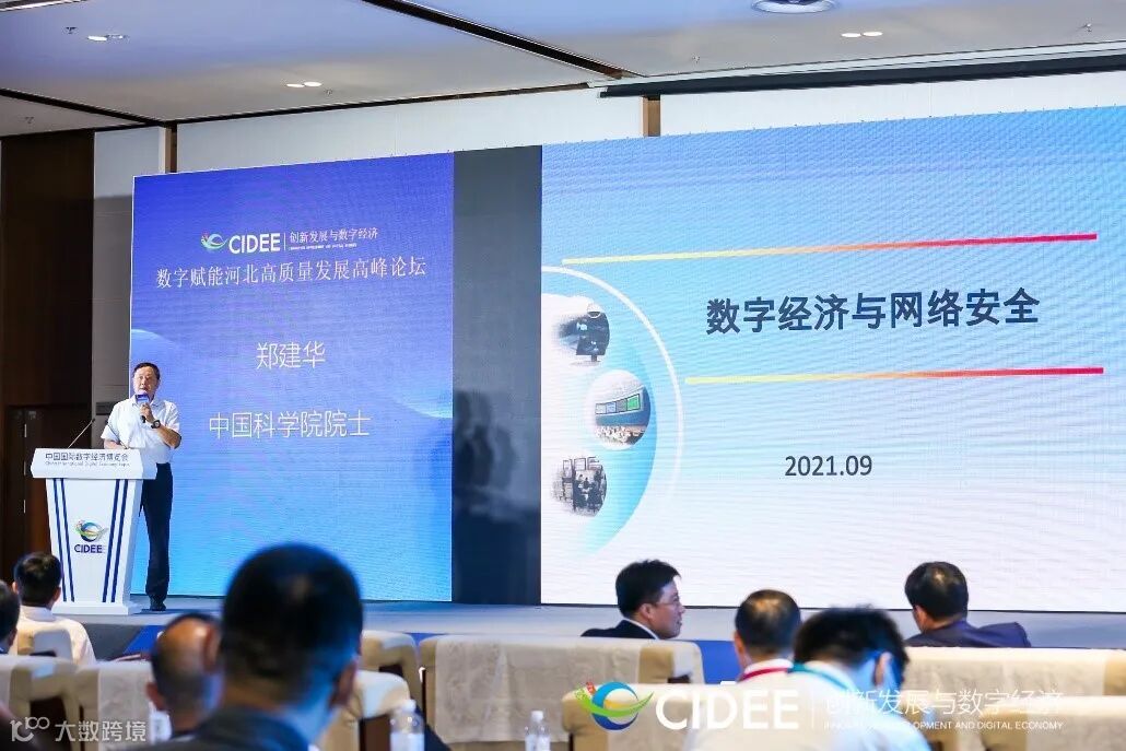 数字赋能河北高质量发展高峰论坛由中国国际数字经济博览会组委会主办,河北省数字经济联合会、河北省电子学会、上海计算机软件技术开发中心联合承办。河北省数字经济联合会会长吴显国,共青团河北省委副书记孙贺,河北省委网信办室务会成员、二级巡视员、河北省互联网行业党委书记崔文武,河北省科学技术厅党组副书记、副厅长郭玉明,河北省科协党组成员、副主席郑丽萍等领导出席论坛。此次论坛中,上海软件中心邀请中国科学院郑建华院士参加并进行了“数字经济与网络安全”的主旨讲座。