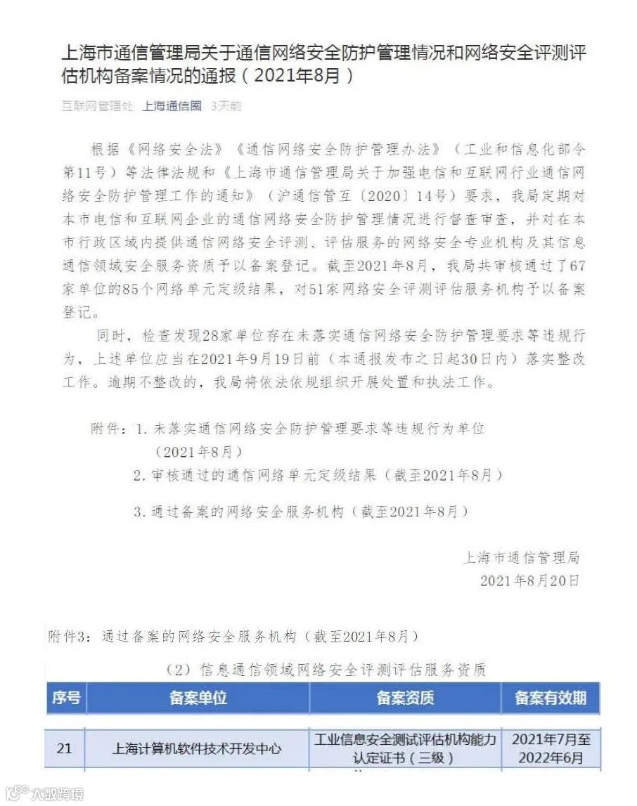 近期,上海市通信管理局发布关于通信网络安全防护管理情况和网络安全评测评估机构备案情况的通报,根据《网络安全法》《通信网络安全防护管理办法》(工业和信息化部令第11号)等法律法规和《上海市通信管理局关于加强电信和互联网行业通信网络安全防护管理工作的通知》(沪通信管互〔2020〕14号)要求,对在本市行政区域内提供通信网络安全评测、评估服务的网络安全专业机构及其信息通信领域安全服务资质予以备案登记。截至2021年8月,上海市通信管理局共审核通过了67家单位的85个网络单元定级结果,对上海计算机软件技术开发中心(以下简称“上海软件中心”)等51家网络安全评测评估服务机构予以登记。