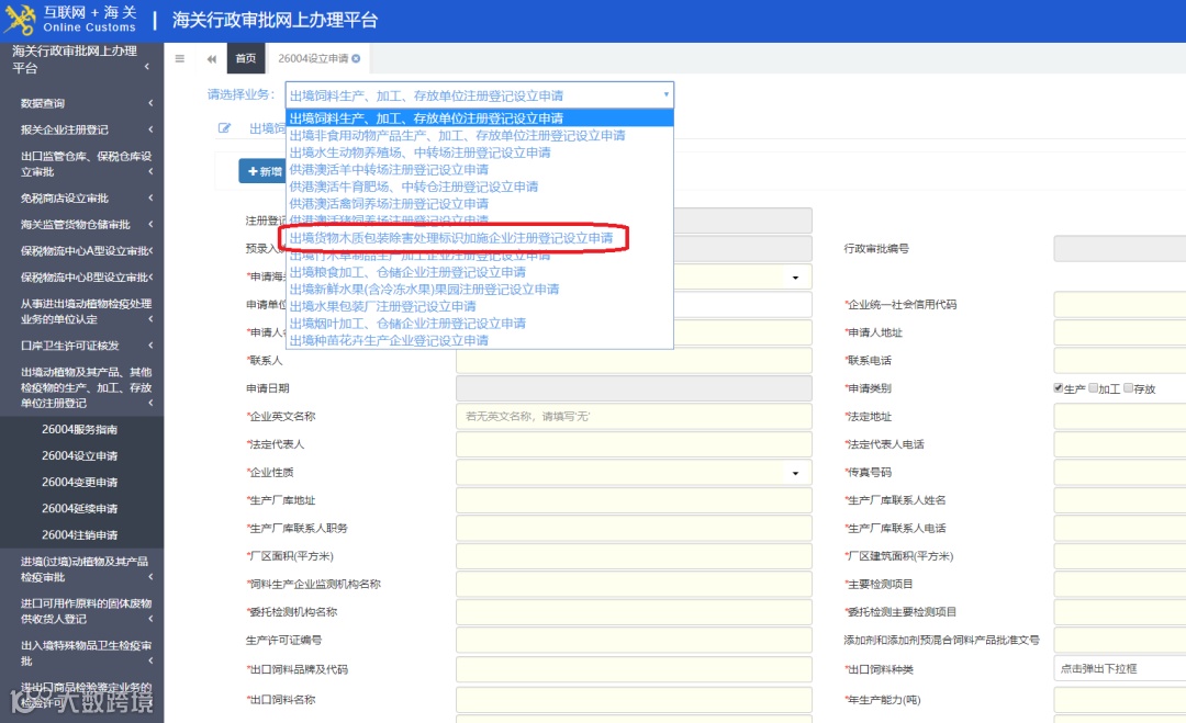 登录“互联网+海关”平台(http://online.customs.gov.cn)→行政审批→更多→出境植物及其产品、其他检疫物的生产、加工、存放单位注册登记→出境货物木质包装除害处理标识加施企业注册登记设立申请。