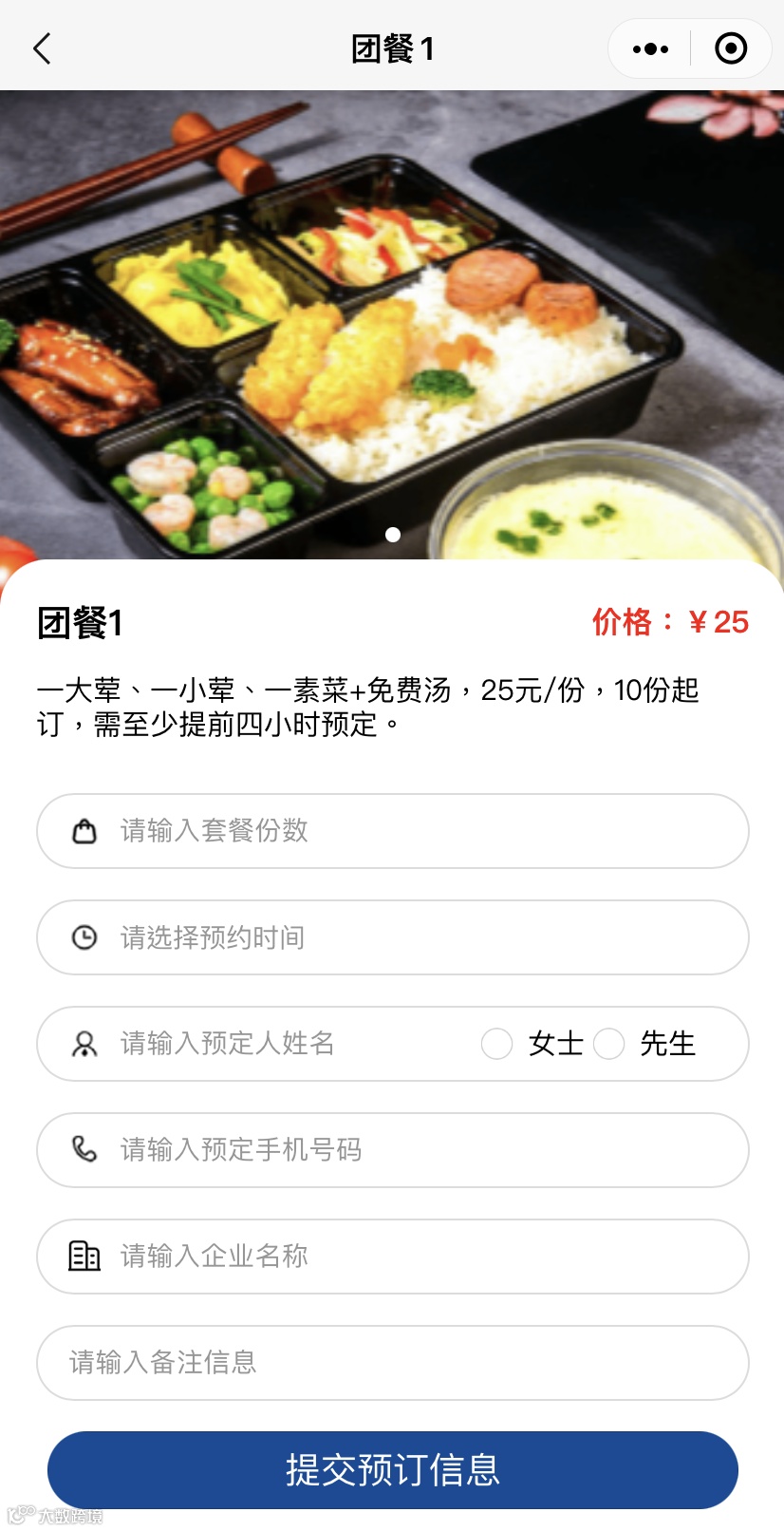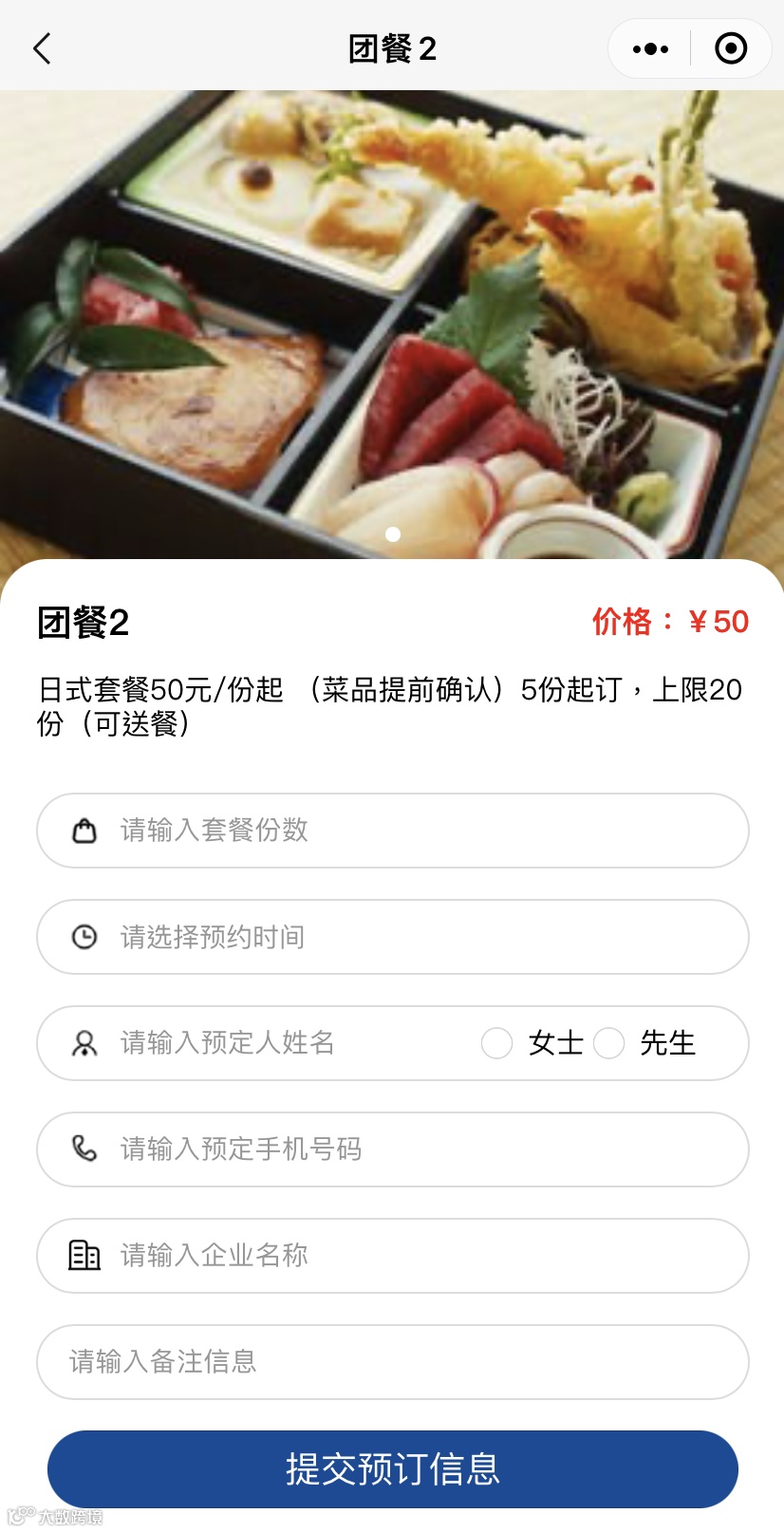 👉 套餐2:日式套餐(菜品提前确认);50元/份起,5份起订,上限20份,可送餐。(送餐需和食堂进行沟通确认)