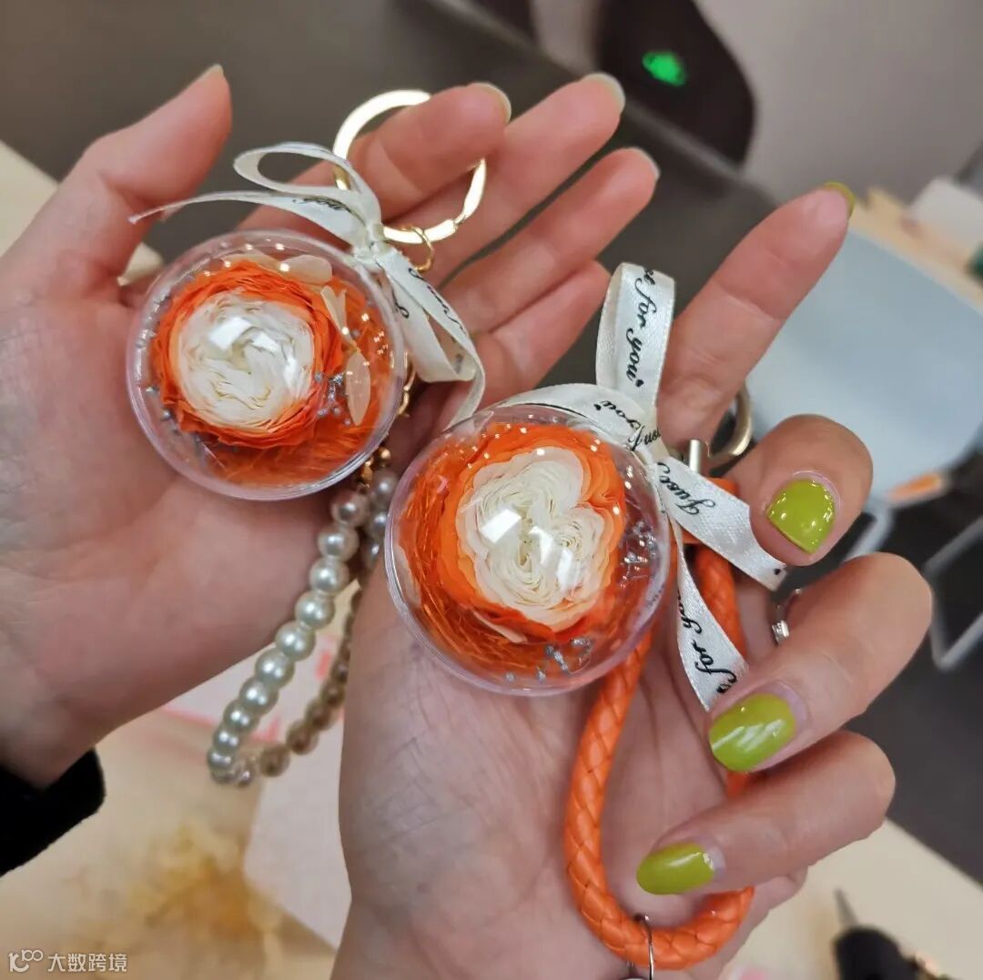 女神们把色彩缤纷的永生花和各种各样的辅助材料,铺在半圆形的容器中,制作出自己心中的那幅景象,最后再将容器固定住,一个个漂亮别致的永生花钥匙扣在“巧手”中绽放光彩。